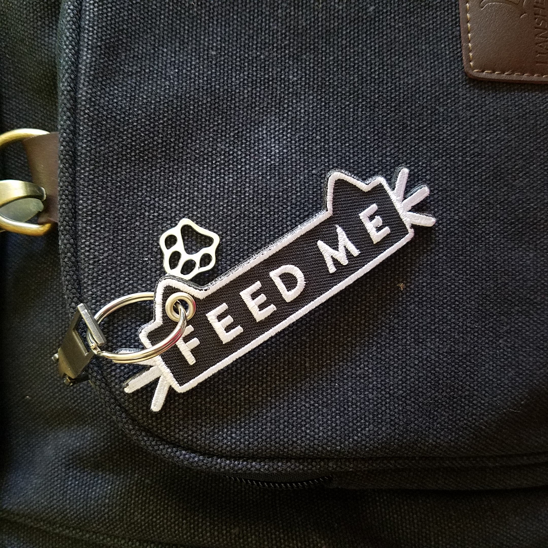 The perfect keychain for people with only two moods. Feed Me and Go Away. Double-sided embroidery featuring a pawprint charm.